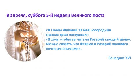 8 апреля, суббота 5-й недели Великого поста «В Своем Явлении 13 мая Богородица сказала трем пастушкам: «Я хочу, чтобы вы читали Розарий каждый день». Можно сказать, что...