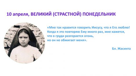 10 апреля, ВЕЛИКИЙ (СТРАСТНОЙ) ПОНЕДЕЛЬНИК «Мне так нравится говорить Иисусу, что я Его люблю! Когда я это повторяю Ему много раз, мне кажется, что в груди разгорается...