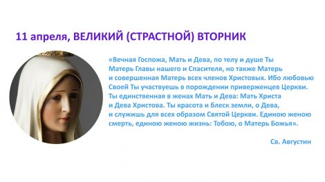 11 апреля, ВЕЛИКИЙ (СТРАСТНОЙ) ВТОРНИК «Вечная Госпожа, Мать и Дева, по телу и душе Ты Матерь Главы нашего и Спасителя, но также Матерь и совершенная Матерь всех членов...