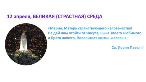 12 апреля, ВЕЛИКАЯ (СТРАСТНАЯ) СРЕДА «Мария, Матерь странствующего человечества! Не дай нам отойти от Иисуса, Сына Твоего Любимого и Брата нашего, Повелителя жизни и...