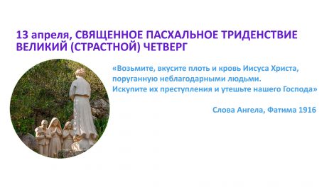 13 апреля, СВЯЩЕННОЕ ПАСХАЛЬНОЕ ТРИДЕНСТВИЕ ВЕЛИКИЙ (СТРАСТНОЙ) ЧЕТВЕРГ «Возьмите, вкусите плоть и кровь Иисуса Христа, поруганную неблагодарными людьми. Искупите их...