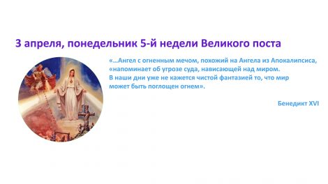 3 апреля, понедельник 5-й недели Великого поста «…Ангел с огненным мечом, похожий на Ангела из Апокалипсиса, «напоминает об угрозе суда, нависающей над миром. В наши дни...