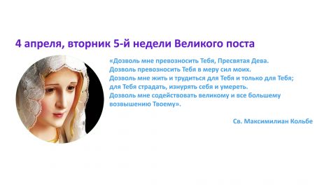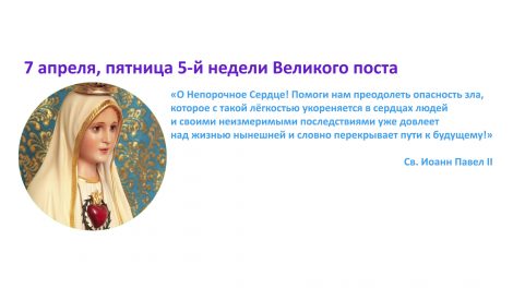 7 апреля, пятница 5-й недели Великого поста «О Непорочное Сердце! Помоги нам преодолеть опасность зла, которое с такой лёгкостью укореняется в сердцах людей и своими...