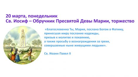 20 марта, понедельник Св. Иосиф – Обручник Пресвятой Девы Марии, торжество «Благословенна Ты, Мария, послана Богом в Фатиму, принесшая миру послание надежды, призыв к...