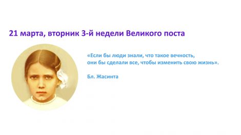 21 марта, вторник 3-й недели Великого поста «Если бы люди знали, что такое вечность, они бы сделали все, чтобы изменить свою жизнь». Бл. Жасинта ...