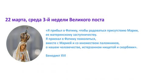 22 марта, среда 3-й недели Великого поста «Я прибыл в Фатиму, чтобы радоваться присутствию Марии, ее материнскому заступничеству. Я приехал в Фатиму помолиться, вместе с...