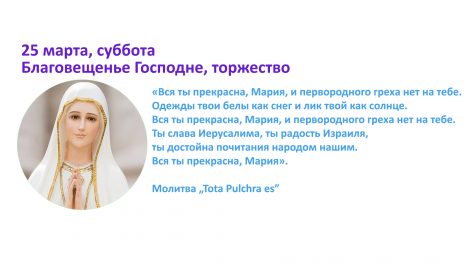 25 марта, суббота Благовещенье Господне, торжество «Вся ты прекрасна, Мария, и первородного греха нет на тебе. Одежды твои белы как снег и лик твой как солнце. Вся ты...